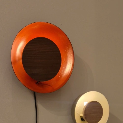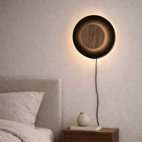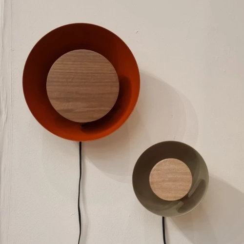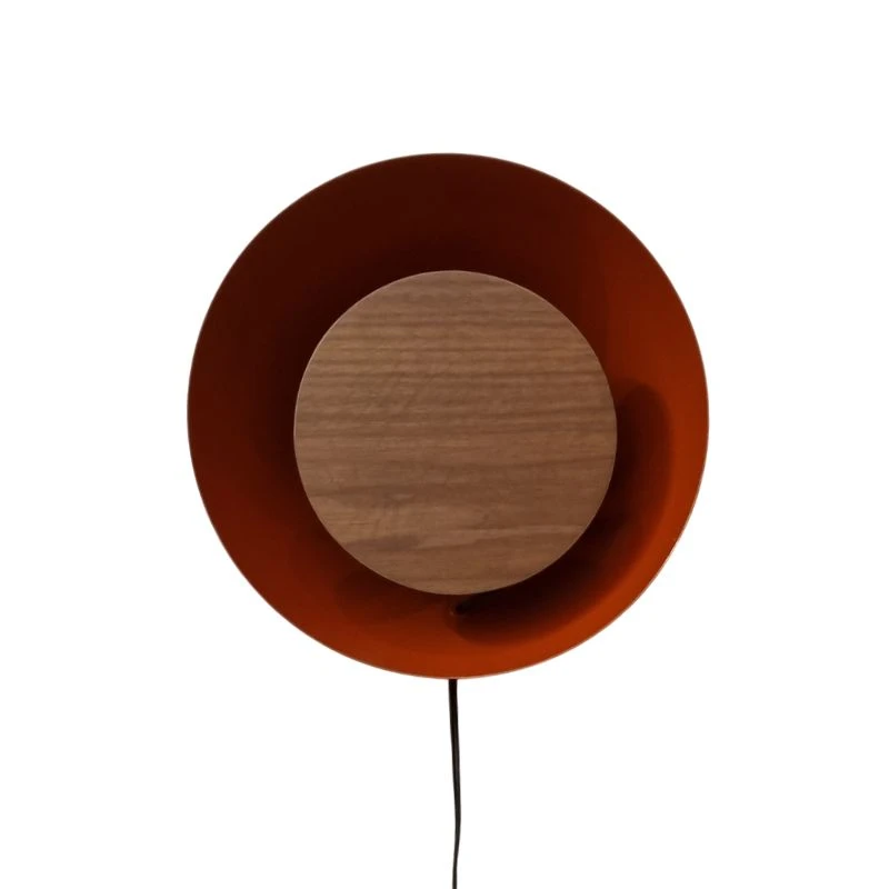 Lámpara a muro; cuenta con una base de media esfera en acero que proporciona iluminación ambiental indirecta, acentuada por un disco frontal de madera sólida / Medidas aproximadas: 29 cm de diámetro