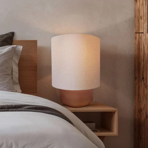 Lámpara de mesa con base de terracota y pantalla en lino / Medidas generales: 35 cm diam x h 50 cm aprox.