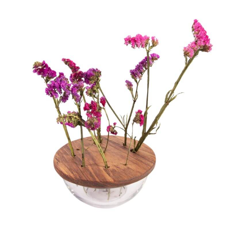 Florero de cristal media esfera chico con cubierta de madera sólida barrenada / Medidas generales: