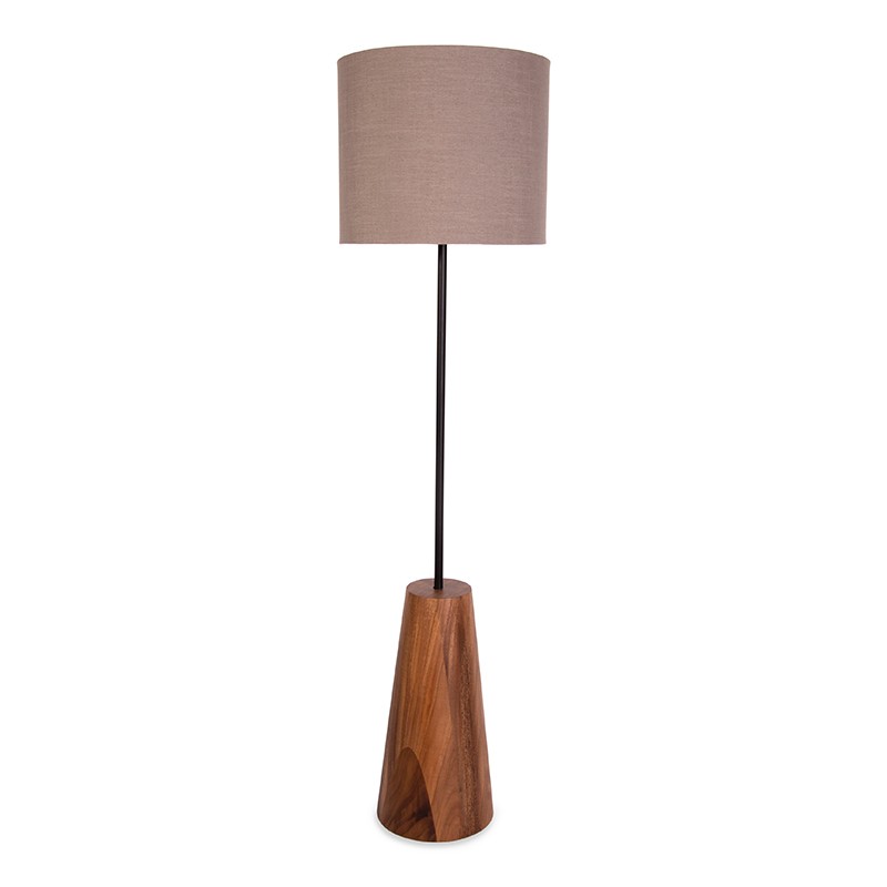 Lámpara de pie con base en madera solida de parota y pantalle en tela.