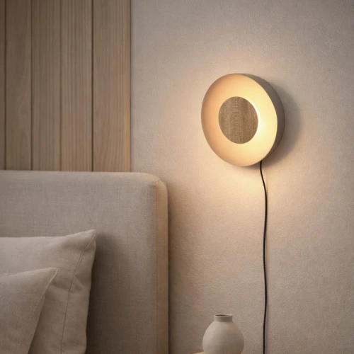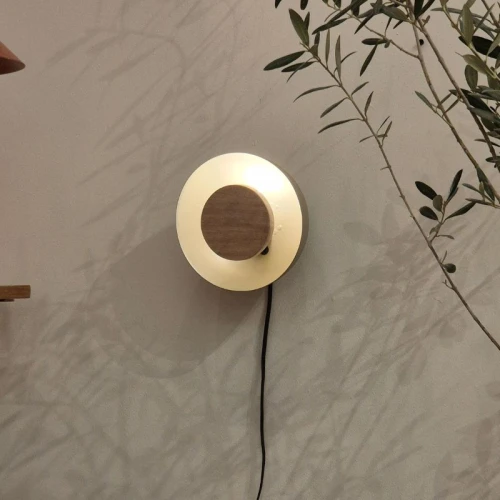Lámpara a muro; cuenta con una base de media esfera en acero que proporciona iluminación ambiental indirecta, acentuada por un disco frontal de madera sólida en la parte media / Medidas aproximadas: 19 cm de diámetro