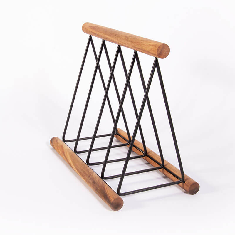 Revistero en forma triangular de acero con bastones de madera sólida / Medidas generales: 20 x 40 x H:35cm